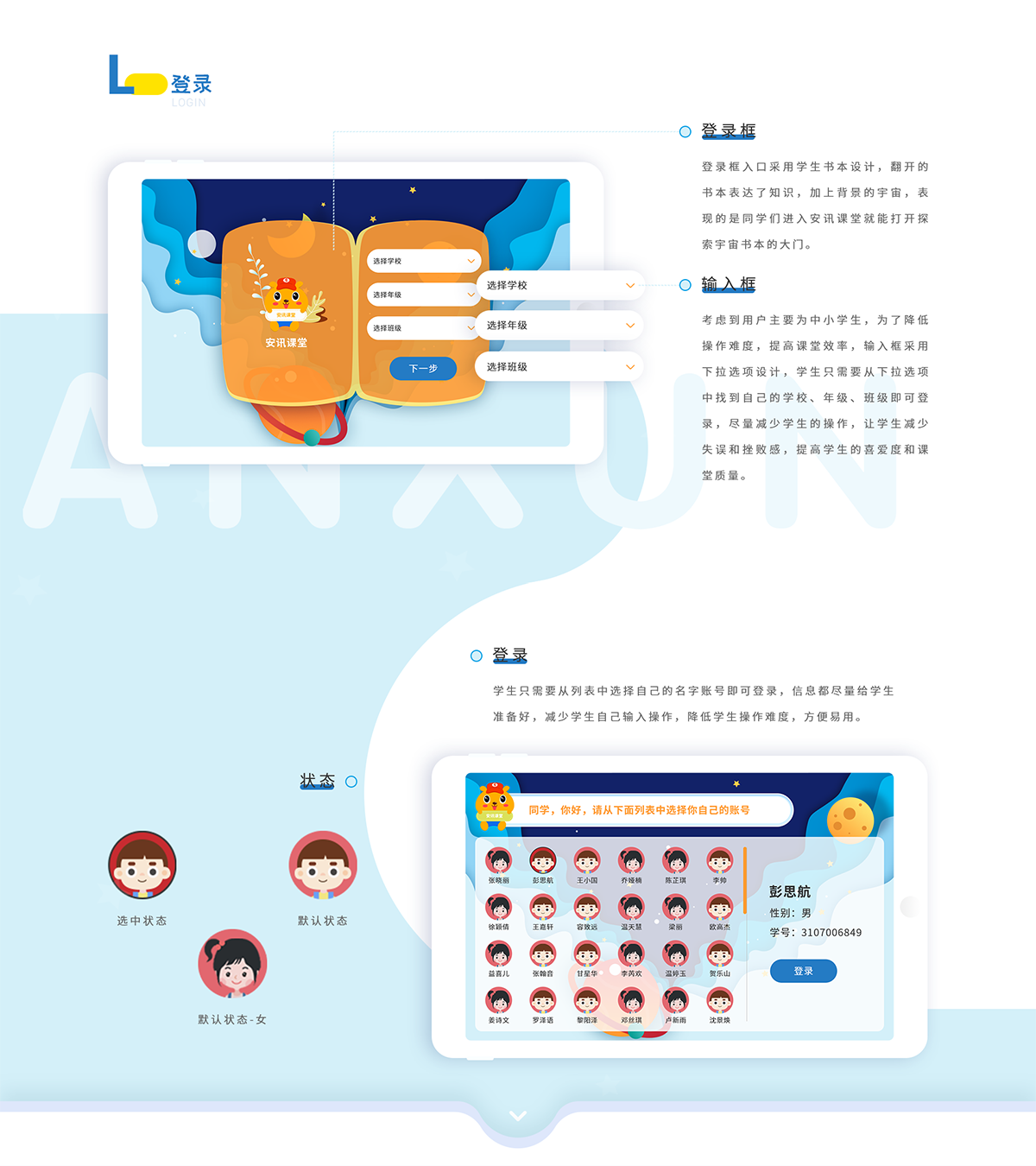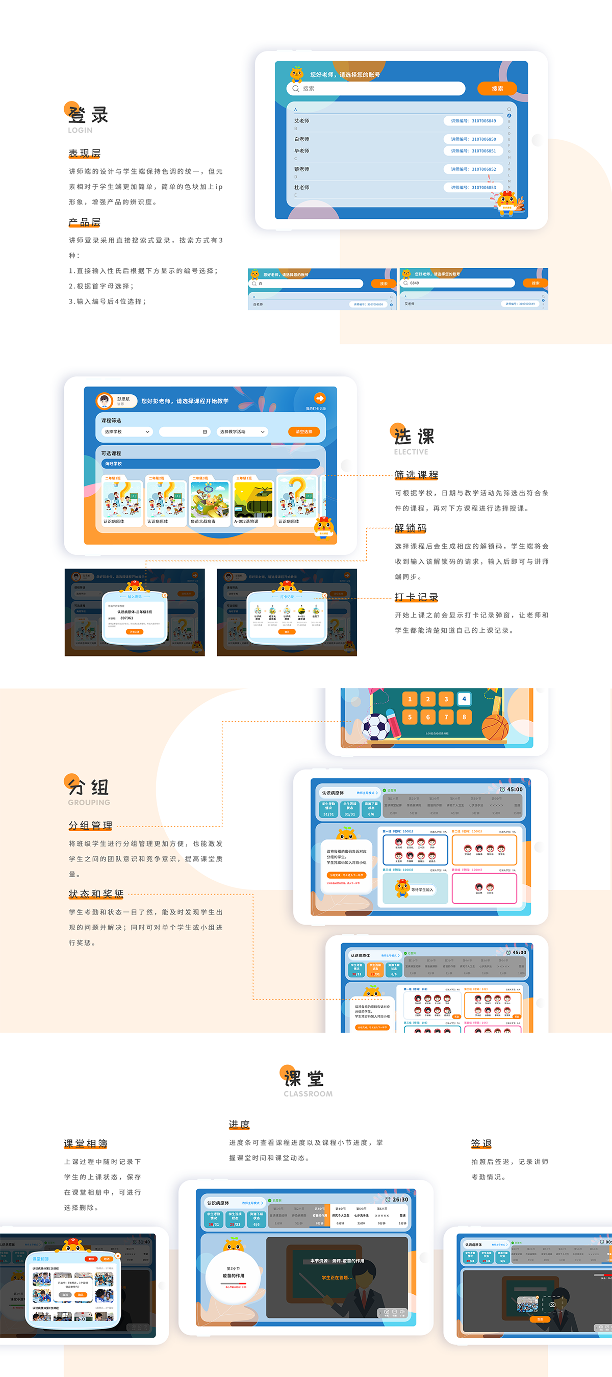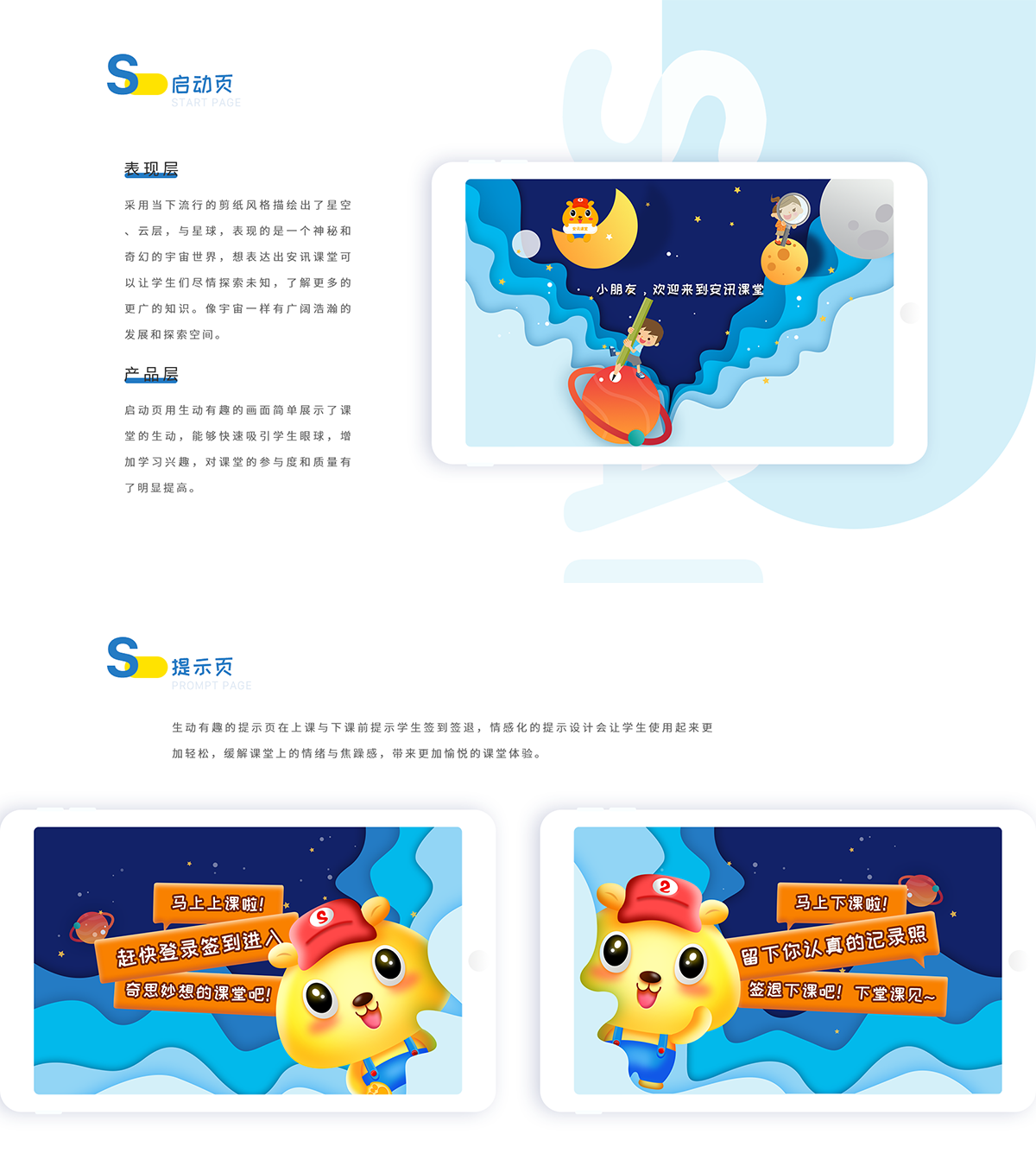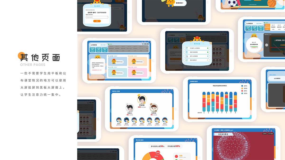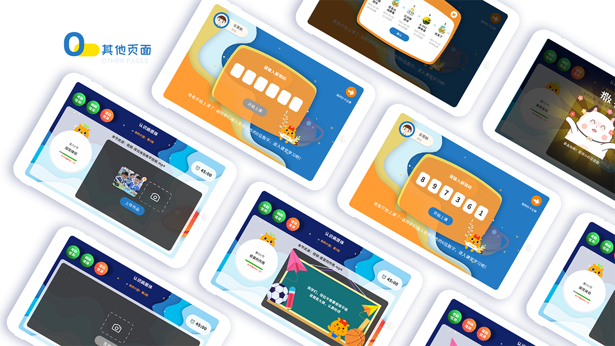 因本产品的用户群体为教师和中小学学生,故定位为简洁易用,有趣生动的风格。提升课堂的趣味性和学生参与的积极性,故学生端采用大量的图画和鲜艳的颜色便于学生操作以及提升学生的体验感,而教师端为了和学生端形成统一的风格,在色彩和风格上与学生端保持统一,但相较于学生端会更少图画,更加规范,引导性更强,也符合老师这一用户的身份定位。