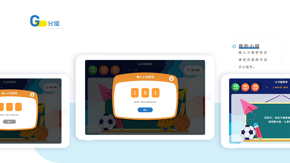 登录后教师端老师会对学生进行分组,每个学生就会收到自己小组的密码,输入小组密码后即可进入课堂学习页面,上面会显示自己的小组号。对学生进行分组是为了更好的管理学生和设立奖惩制度,让小组之间树立竞争意识,提高课堂活跃度与学生参与积极性。